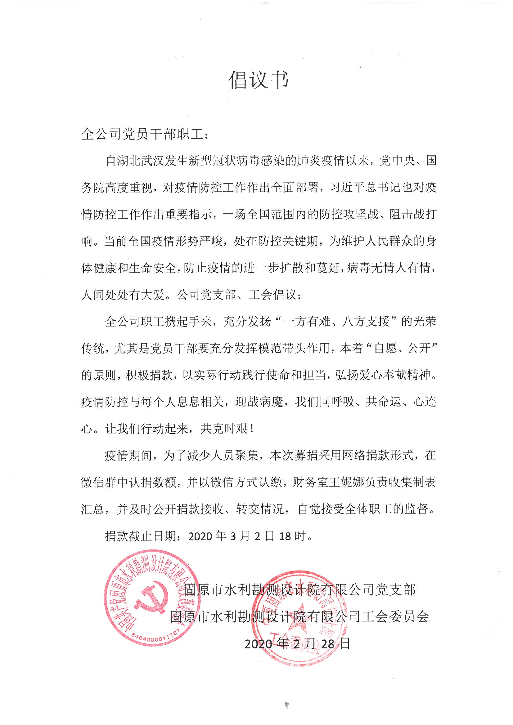 固原市水利勘測設計院有限公司為武漢疫情捐款